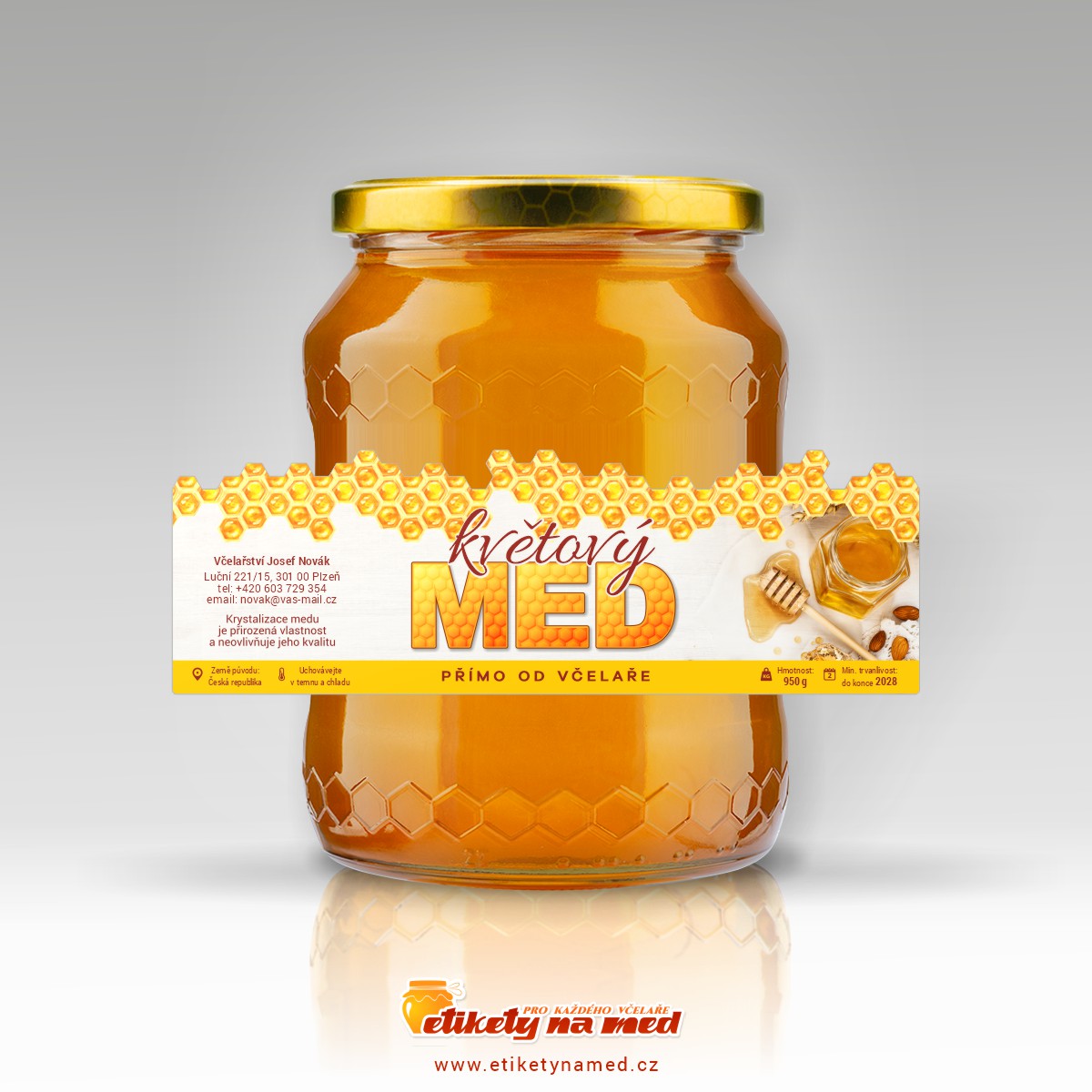 Etiketa je samolepící o rozměru 141x46mm, etiketa má horní okraj jako tvar buněk plástu a působí velmi efektně. Etikety na med, vhodné pro svazové ČSV sklenice 720ml nebo 730ml a jiné sklenice většího i menšího rozměru.  Vybranou etiketu vám upravíme dle požadavku, změnit je možné druh medu, uvedenou hmotnost, jméno včelaře / producenta, adresu, kontakt, případně rok.