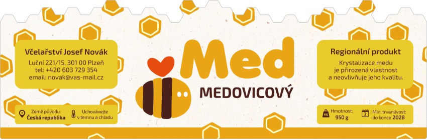 Etiketa je samolepící o rozměru 141x46mm, etiketa má horní okraj jako tvar buněk plástu a působí velmi efektně. Etikety na med, vhodné pro svazové ČSV sklenice 720ml nebo 730ml a jiné sklenice většího i menšího rozměru.  Vybranou etiketu vám upravíme dle požadavku, změnit je možné druh medu, uvedenou hmotnost, jméno včelaře / producenta, adresu, kontakt, případně rok.