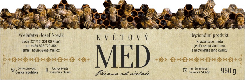 Etiketa je samolepící o rozměru 141x46mm, etiketa má horní okraj jako tvar buněk plástu a působí velmi efektně. Etikety na med, vhodné pro svazové ČSV sklenice 720ml nebo 730ml a jiné sklenice většího i menšího rozměru.  Vybranou etiketu vám upravíme dle požadavku, změnit je možné druh medu, uvedenou hmotnost, jméno včelaře / producenta, adresu, kontakt, případně rok.