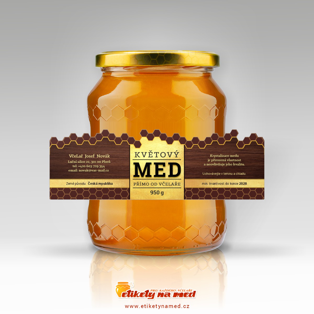 Etiketa je samolepící o rozměru 141x46mm, etiketa má horní okraj jako tvar buněk plástu a působí velmi efektně. Etikety na med, vhodné pro svazové ČSV sklenice 720ml nebo 730ml a jiné sklenice většího i menšího rozměru.  Vybranou etiketu vám upravíme dle požadavku, změnit je možné druh medu, uvedenou hmotnost, jméno včelaře / producenta, adresu, kontakt, případně rok.
