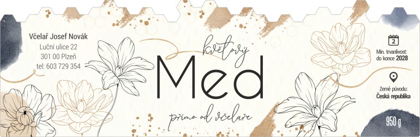 Etiketa je samolepící o rozměru 141x46mm, etiketa má horní okraj jako tvar buněk plástu a působí velmi efektně. Etikety na med, vhodné pro svazové ČSV sklenice 720ml nebo 730ml a jiné sklenice většího i menšího rozměru.  Vybranou etiketu vám upravíme dle požadavku, změnit je možné druh medu, uvedenou hmotnost, jméno včelaře / producenta, adresu, kontakt, případně rok.