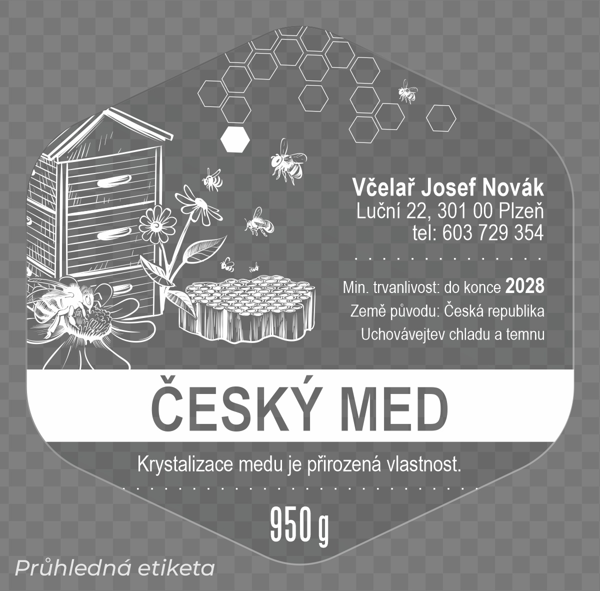 Úvod > Transparentní etikety na med > Transparentní etikety na med šestihranné 62x61mm zaoblené - tisk bílou