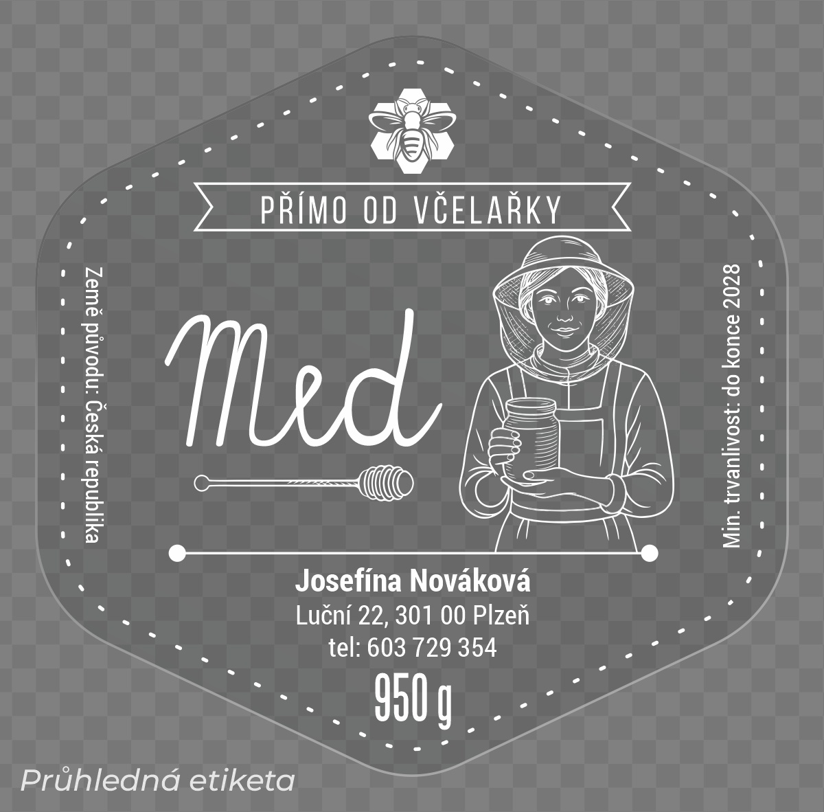 Úvod > Transparentní etikety na med > Transparentní etikety na med šestihranné 62x61mm zaoblené - tisk bílou