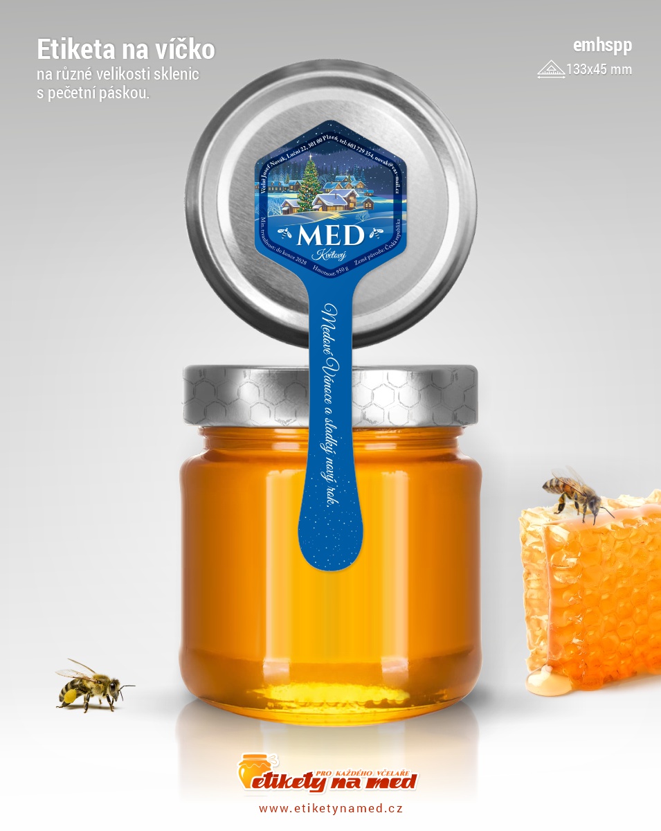 Šestihranná etiketa s pečetní páskou ve tvaru kapky medu vhodná na víčka různých velikostí s přelepením pásky na sklenici. Efektní páska ve tvaru stékající kapky medu. Etiketa je vhodná jak pro sklenice všech běžných objemů, tak i pro malé skleničky, kde se využije jako hlavní etiketa na víčko s páskou na sklenici. Etiketa má celkovou délku 133mm a šestihran 45mm. Zapečetěná sklenice vzbuzuje u spotřebitelů důvěru.