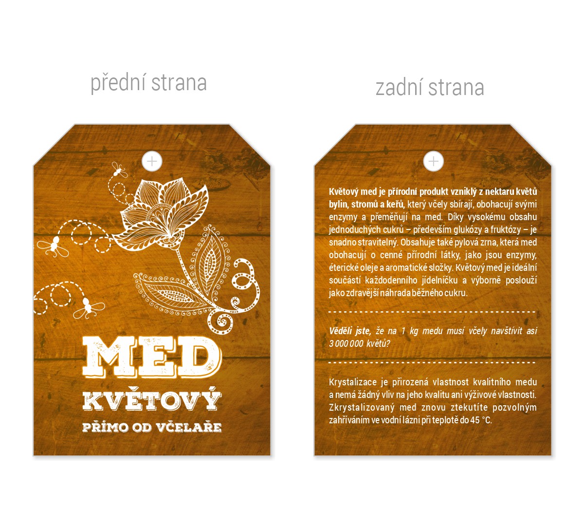 Visačky ve formátu oboustranné karty o rozměrech 48 × 67 mm s otvorem pro zavěšení nebo přivázání, jsou vhodné pro všechny typy sklenic s medem, případně lahve medoviny, kde je možné visačku připevnit. Visačky jsou dodávány bez dalších úprav, přesně tak, jak je vidíte. Jsou tištěny na 300g křídovém papíře a mají předvrtaný otvor pro uchycení.